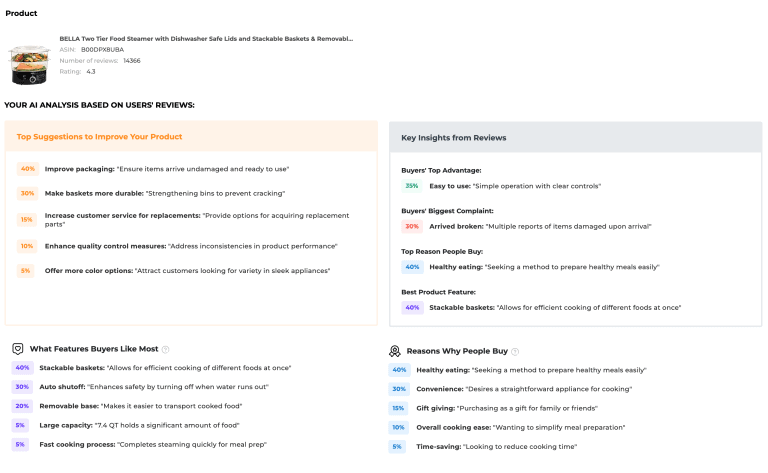 With AMZScout’s tool, understanding customer feedback is fast and visual. Let’s take the BELLA Two-Tier Food Steamer, a popular kitchen gadget on Amazon, as an example to see how the AMZScout AI Review Analyzer works in practice.
