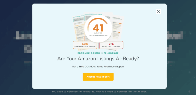 ZonGuru also offers something unique: a free COSMO & Rufus AI Readiness Report, which scores your current listing based on how well it performs with AI-driven systems like Amazon’s new search algorithm and Q&A coverage. This is a helpful way to benchmark your listings before diving deeper.