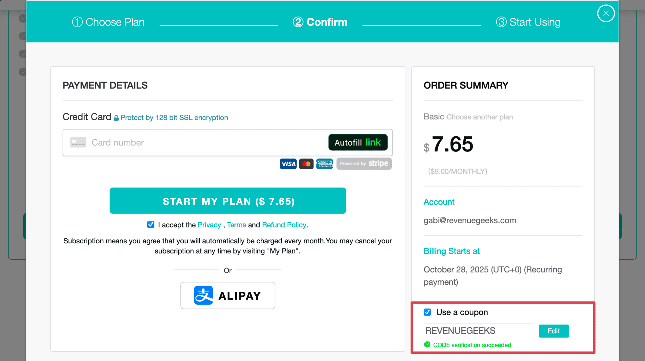 - On the payment page, check the box next to “Use a coupon,” paste in REVENUEGEEKS, and click Use. You should see the green “CODE verification succeeded” message and updated price.