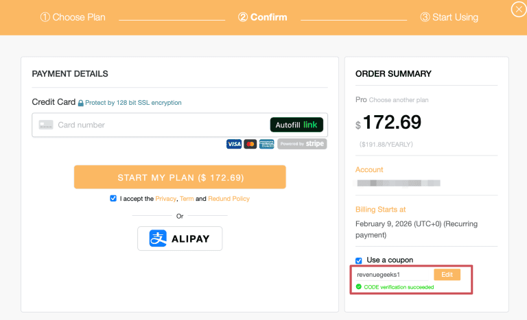 - Click “Use a coupon” and enter the coupon code revenuegeeks1.