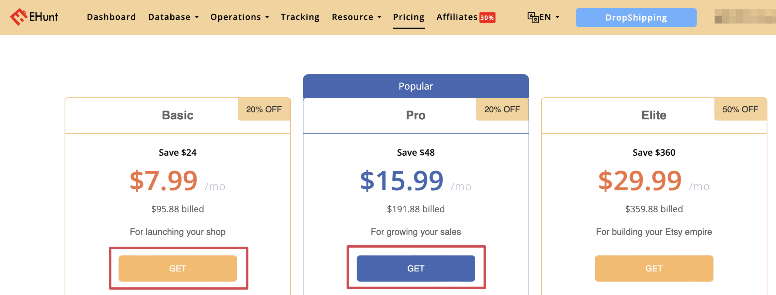 - Once logged into your EtsyHunt account, click “Pricing” again.