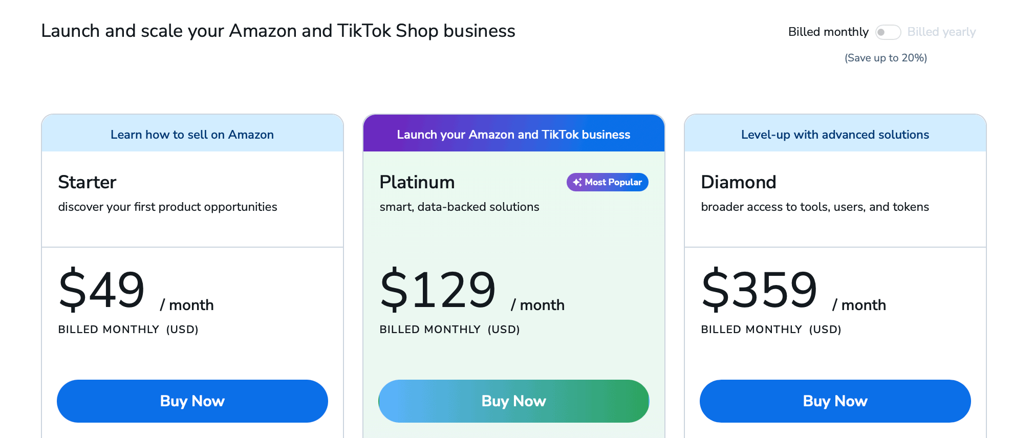 Go for the Platinum Plan. This is where most sellers land. You get full tool access, keyword tracking, profit analytics, and email automation – everything you need to grow and stay profitable. - Managing multiple products, brands, or accounts?