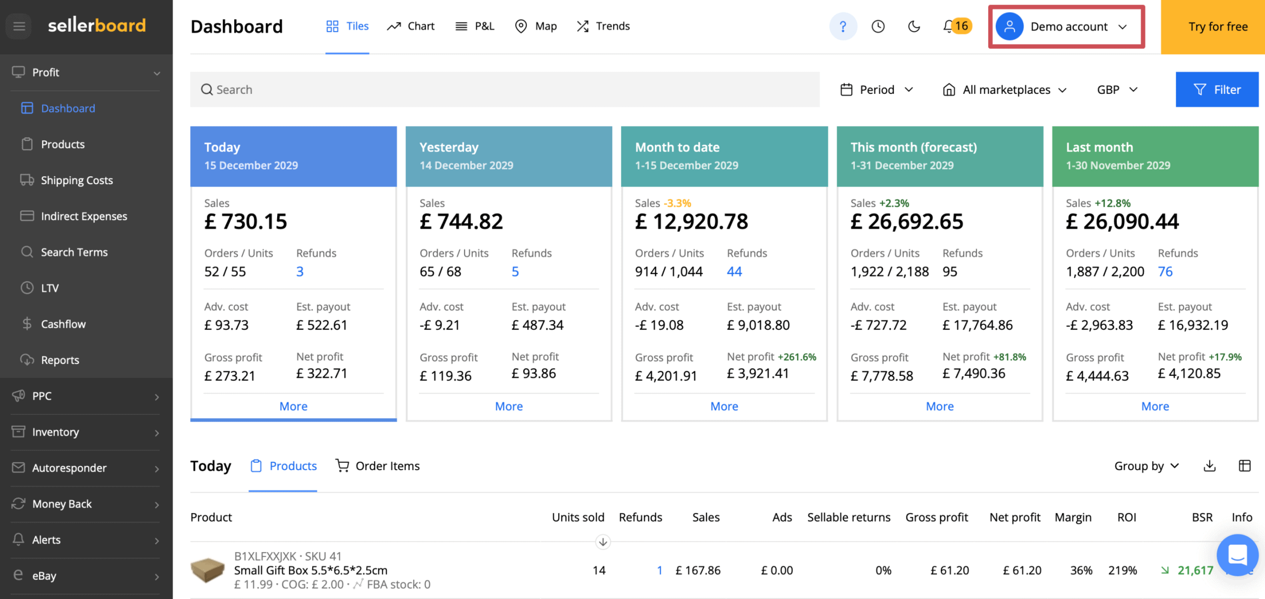 - If you don’t have an active Amazon seller account, you can still try out Sellerboard’s features using their demo account, although the free trial requires a live Amazon connection.
