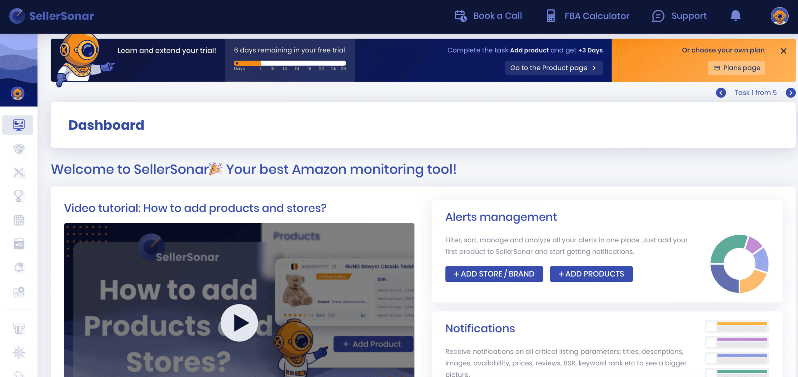 Once inside the dashboard, you’ll see how many days remain in your trial. To unlock the full 29-day access, SellerSonar asks you to complete a few quick onboarding tasks – like adding your first ASIN or setting up an alert.