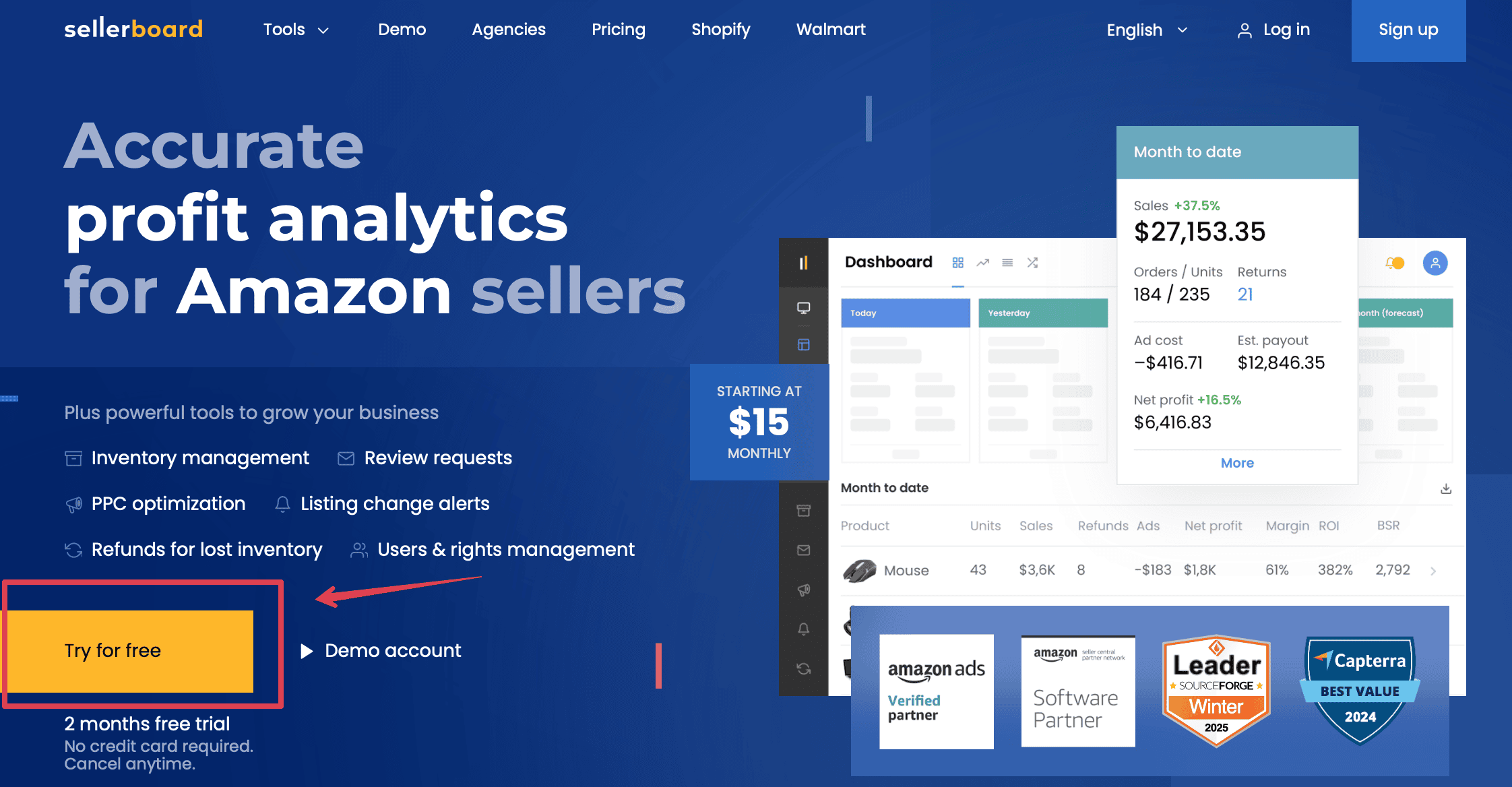Sellerboard focuses on profit analytics, PPC optimization, and inventory forecasting. It’s an ideal tool for FBA sellers who want deep insights into costs, profit margins, and ad spend. Best of all, sellerboard offers a 2-month free trial – one of the longest in the industry.