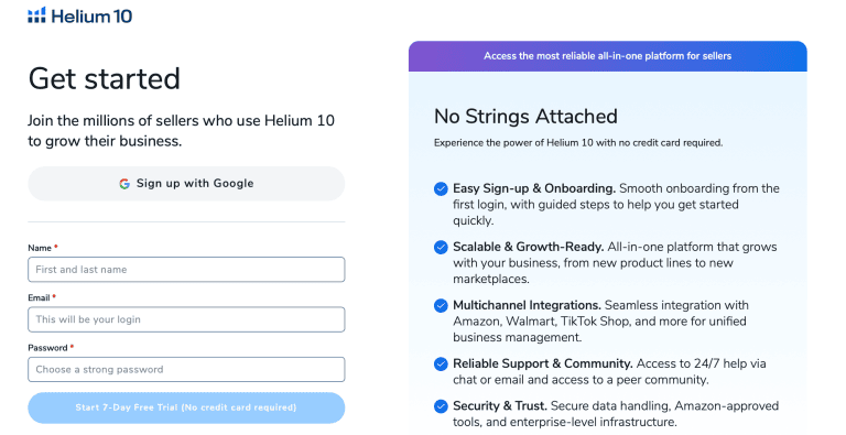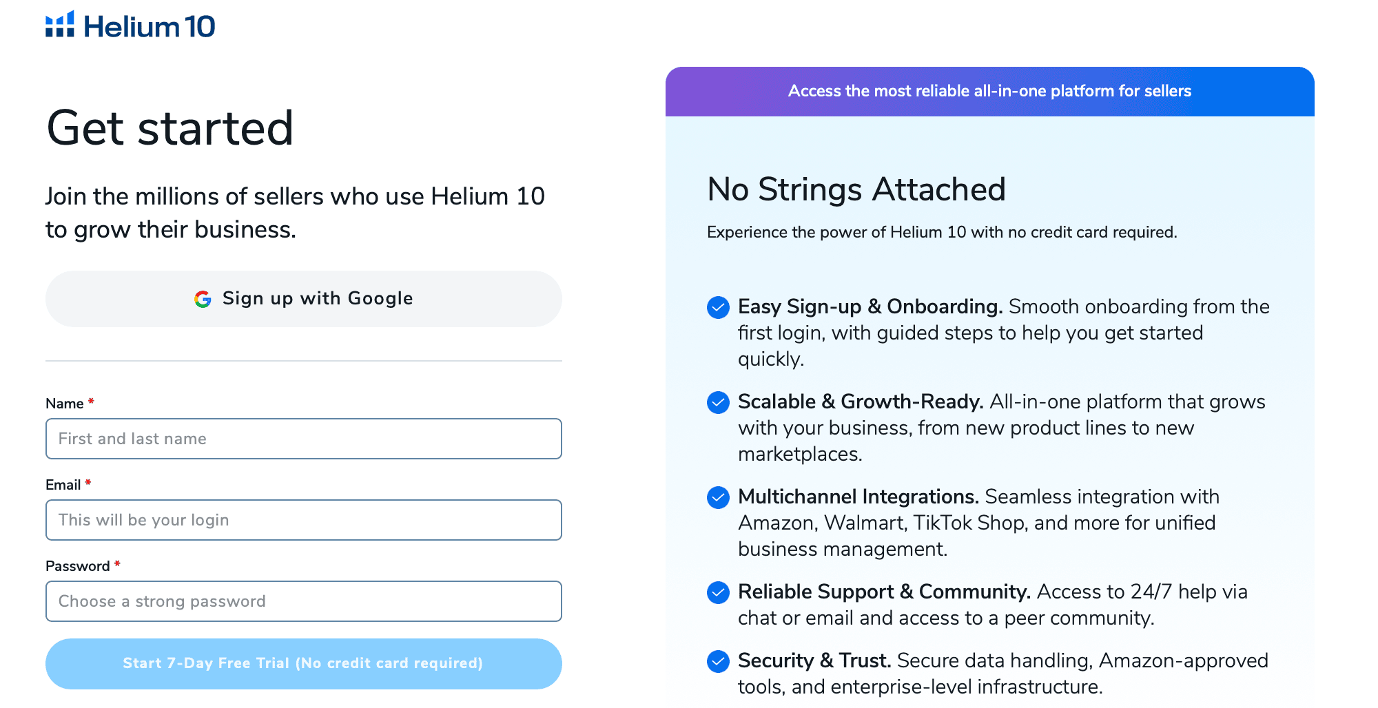 Helium 10 is an all-in-one Amazon seller suite offering advanced tools for product research, keyword tracking, listing optimization, and PPC management. Its 7-day free trial gives you access to essential features to evaluate if it’s a good fit for your business.